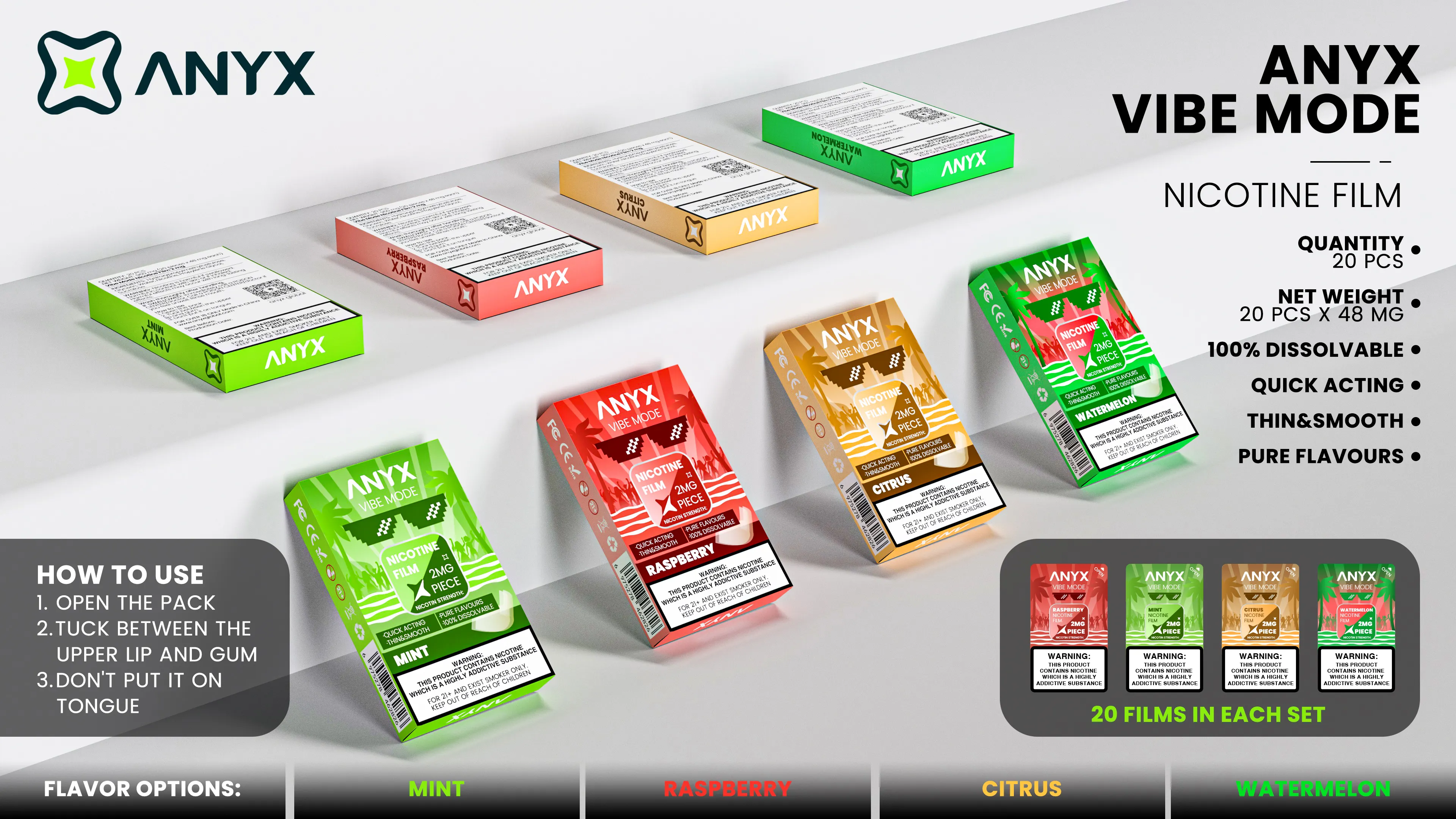 Nicotine Film from ANYX VIBE MODE 20pcs per box, 4 flovars available, Mint, Raspberry, Citrus, Watermelon