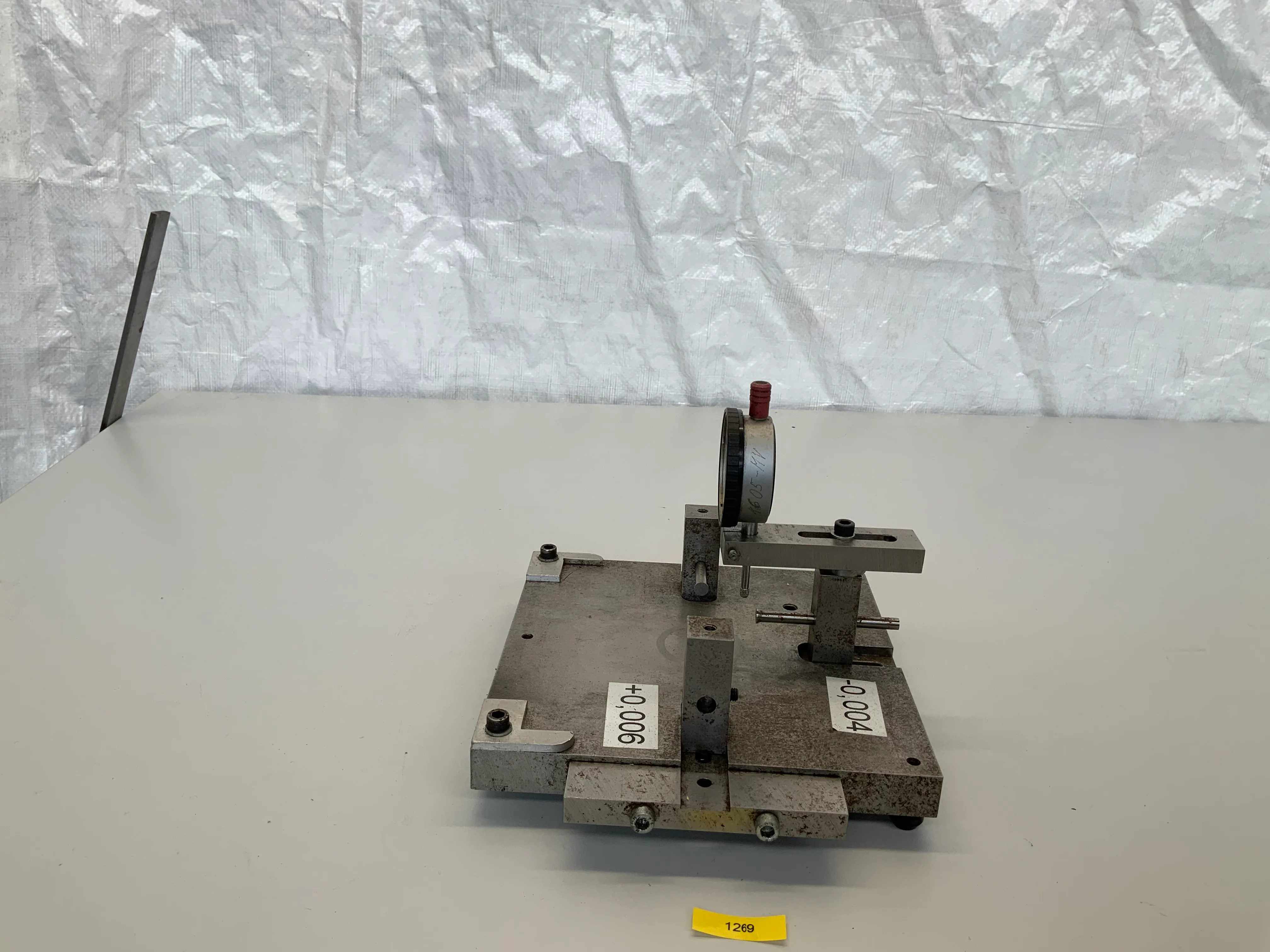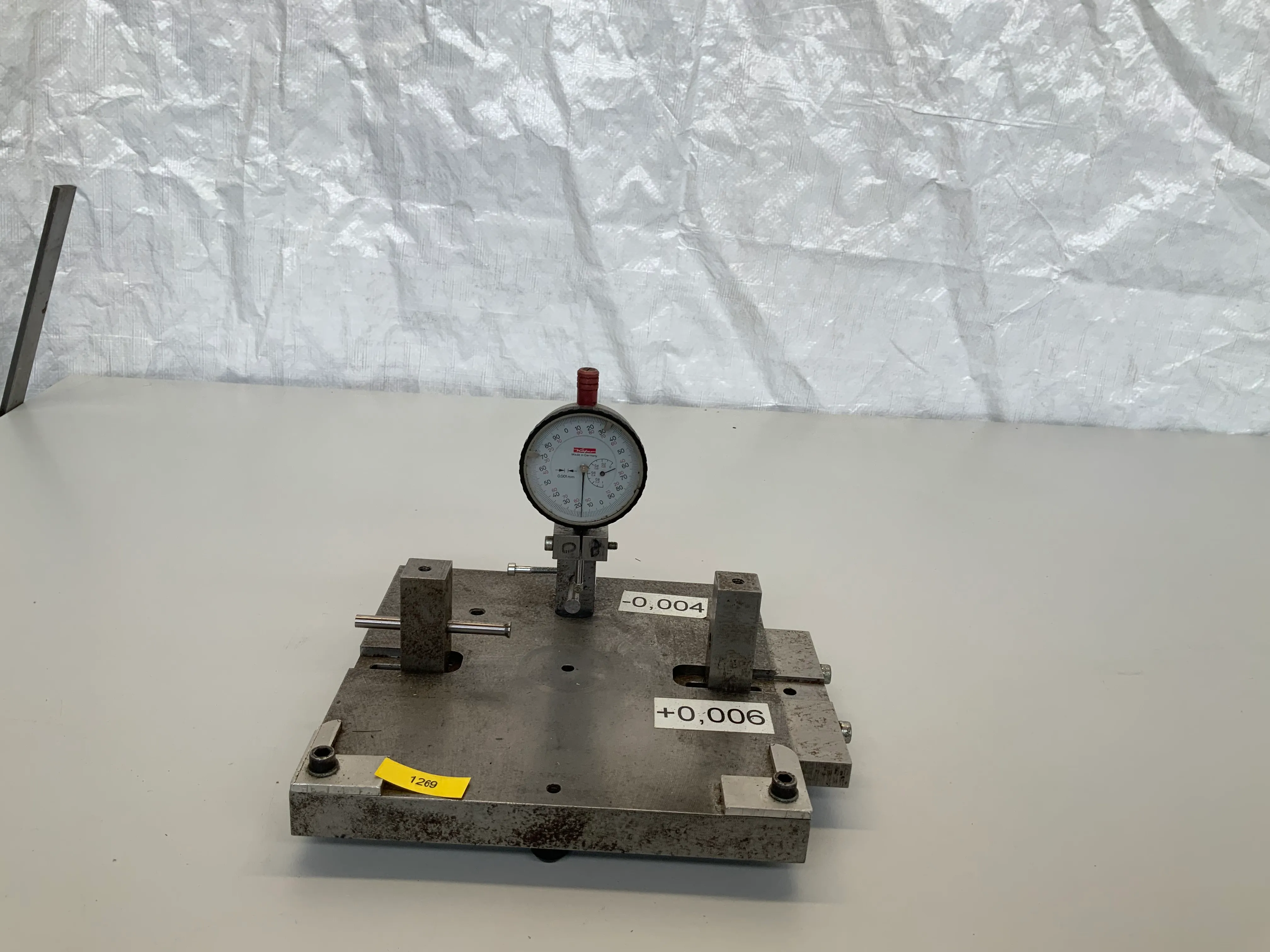 Ich biete eine Prüfvorrichtung mit einer Feinmessuhr der Marke Käfer an (Ablesung 0,01 mm). Die Vorrichtung verfügt über justierbare Anschläge und Halterungen sowie Messbereiche mit Toleranzangaben von -0,004 mm bis +0,006 mm.