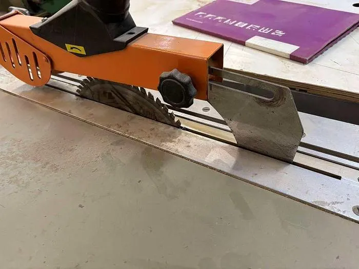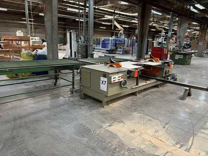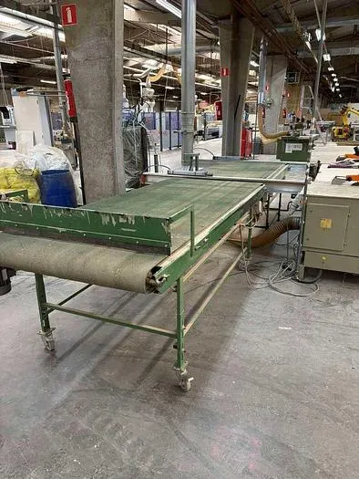 Doppelablängsäge Rema Typ DMGB-35 inkl. Auslauftransportband zum zweiseitigen Ablängen von Hölzern. Diese Maschine wurde speziell genutzt um Türen auf Maß zu Sägen/.Im Istzustand ist die Schnittlänge auf 1.000 mm begrenzt, kann aber erweitert werden.