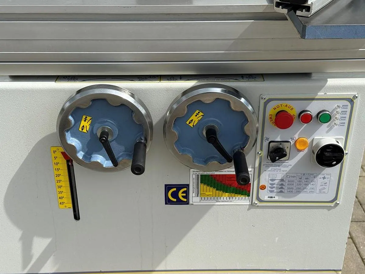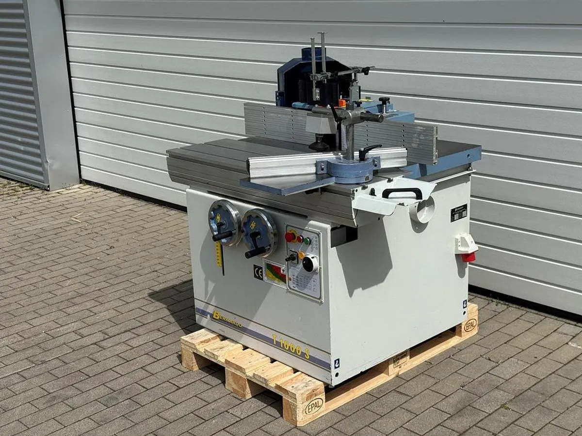 Schwenkspindelfräse Bernardo Typ T 1000S für vielseitige Fräsarbeiten an Massivholz, Plattenmaterial und Profilen. Die Maschine eignet sich ideal für Tischlereien und Schreinerbetriebe, die präzise und leistungsstarke Fräslösungen benötigen. Mit schwenkbarer Spindel, Schiebeschlitten, Winkelanschlag und pneumatischem Niederhalter.