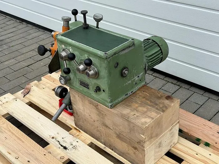 Schärfmaschine Weiss zum Schleifen von kleinen und mittleren Kreissägeblättern.Die Maschine wird auf einer Werkbank befestigt.