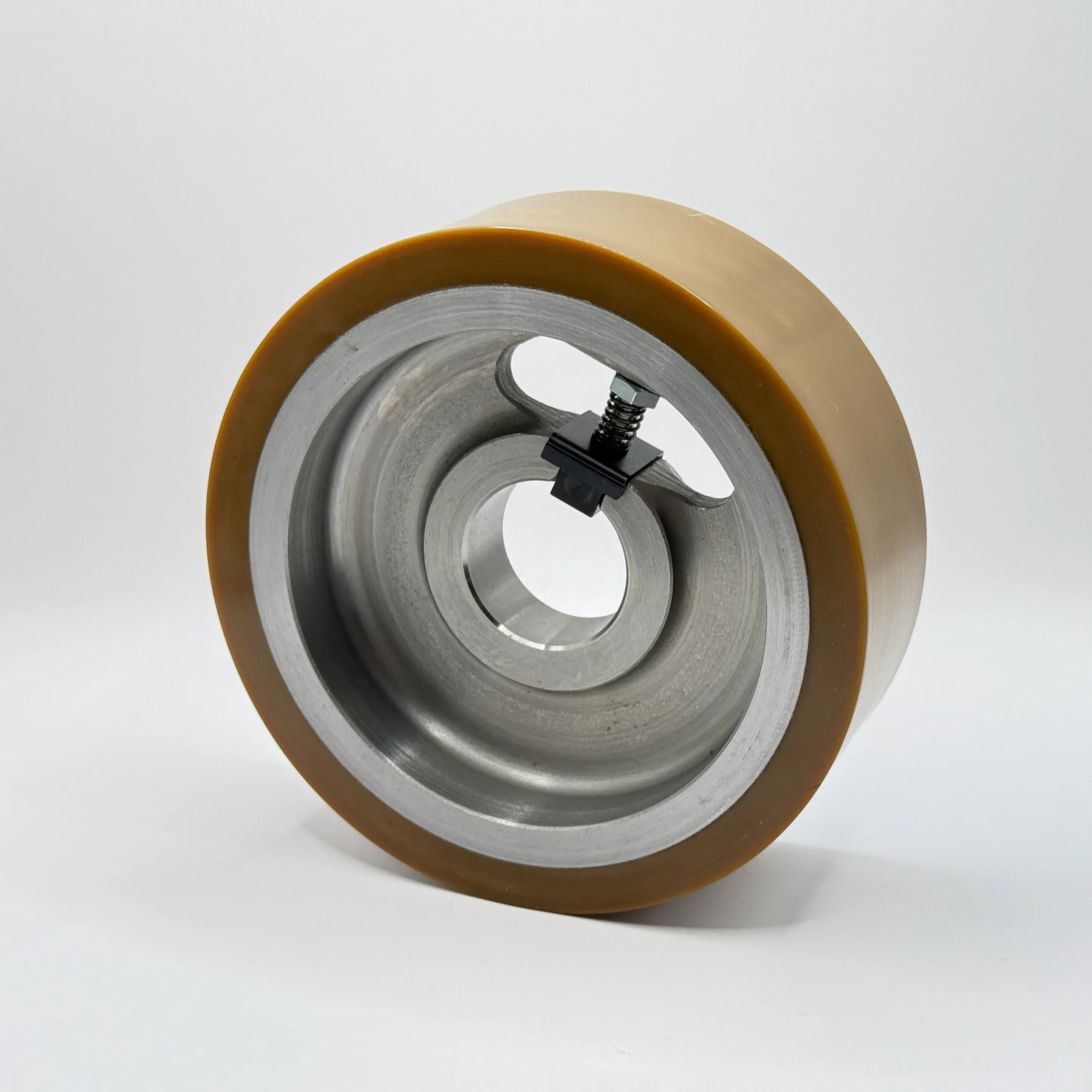 Gummi-Vorschubrolle beziehungsweise Transportwalze zum Einsatz in SCM Hobel- und Kehlautomaten, Vierseitenhobelmaschinen oder ähnlichen Maschinen. Die Rolle wird am Ende der Bearbeitung eingesetzt, um das fertige Werkstück schonend und ohne Beschädigung aus der Maschine zu ziehen.