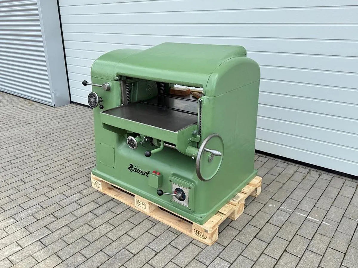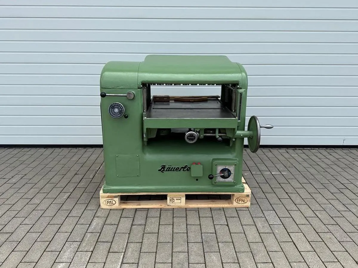 Schwere Dickenhobelmaschine Bäuerle Typ 125/02 zum präzisen Dimensionieren (Dickenhobeln) von Massivholz und Holzwerkstoffen. Die robuste Konstruktion und der leistungsstarke Antrieb sorgen für gleichmäßige Hobelergebnisse und hohe Standzeiten. Inklusive Zubehör.