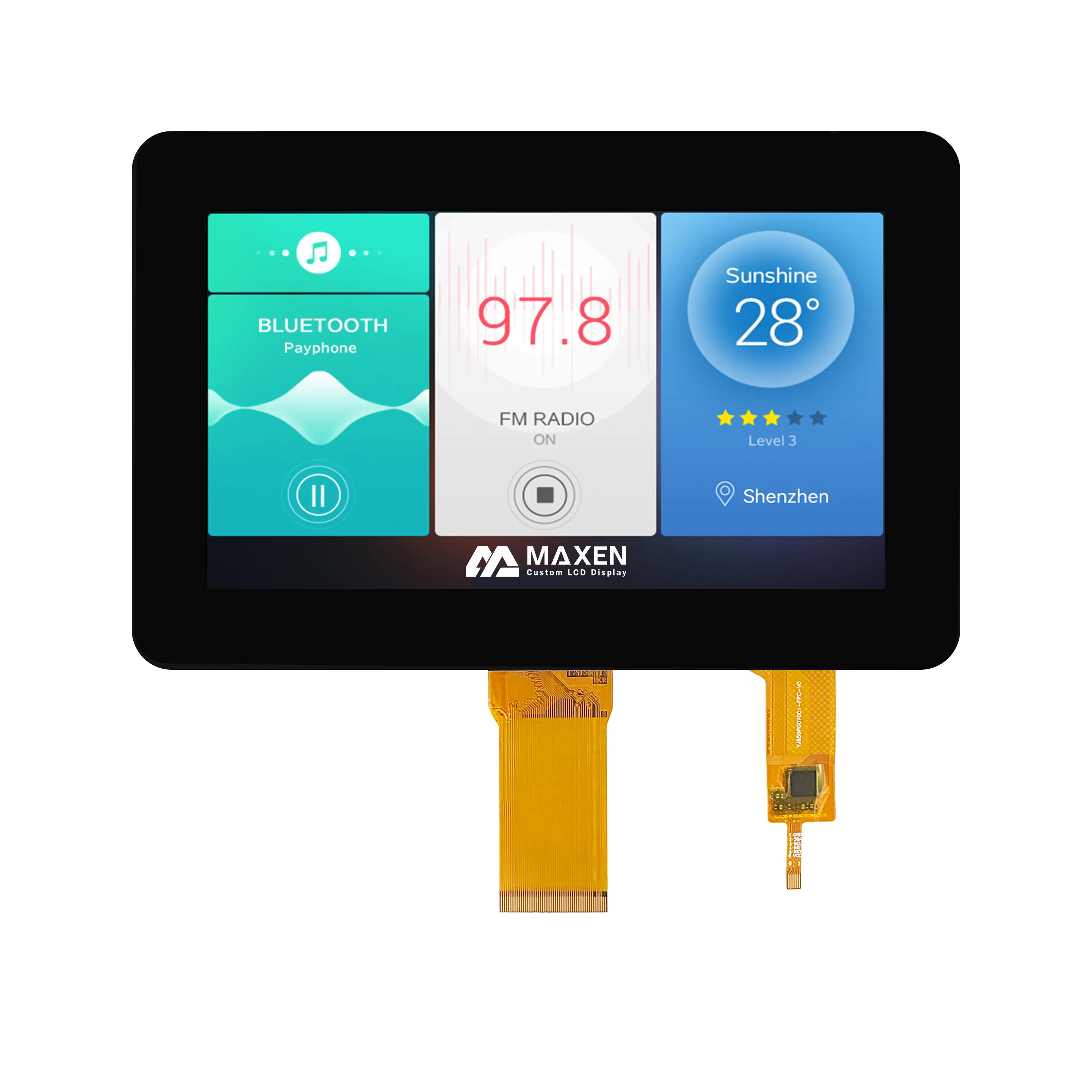 MAXEN MX-B70HR50-IX19-775 is a 7 inch IPS LCD touchscreen with 1024x600 pixel resolution and RGB interface. This display boasts a standard brightness of 300 nits, with a higher brightness version available. The 7 inch IPS LCD touchscreen is commonly used in a variety of applications and is known for its high-quality performance. The 7 inch screen size makes it easy to use and navigate, while the IPS technology ensures clear and vibrant visuals from any angle. With its RGB interface, this product is compatible with a wide range of devices and can easily be integrated into existing systems. The capacitive touch technology provides a smooth and responsive experience, making it ideal for use in a variety of settings, from industrial to consumer applications .
