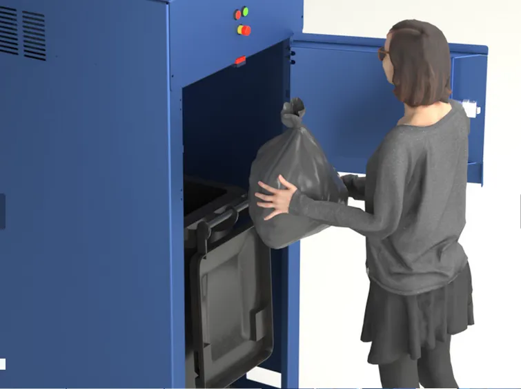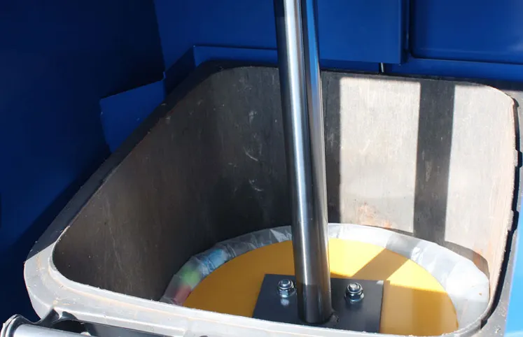 Müllverdichter / Müllpresse für 240 L Mülltonnen (Restbehälter) zur sicheren und schnellen Verdichtung von voluminösem Abfall. Reduziert den Behälterinhalt bis zu 75%, senkt Entsorgungskosten, verbessert Logistik und sorgt für ein sauberes Arbeitsumfeld.