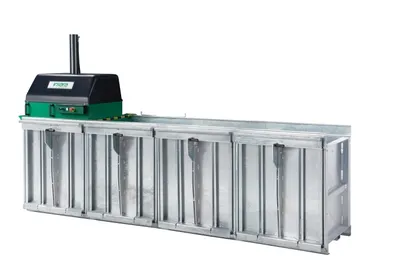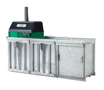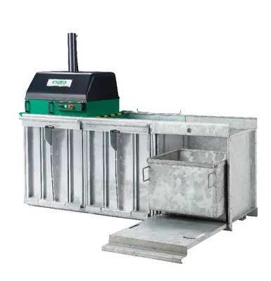Mehrkammerpresse / Wertstoffpresse zum Sortieren und Pressen mit einer Maschine: Abfälle werden direkt in getrennte Pressbehälter gesammelt und anschließend zu handlichen Paketen verdichtet. Modulbauweise(ausbaufähig/nachrüstbar). Feuerverzinkter Unterbau – geeignet für feuchte Umgebung und Outdoor-Aufstellung.