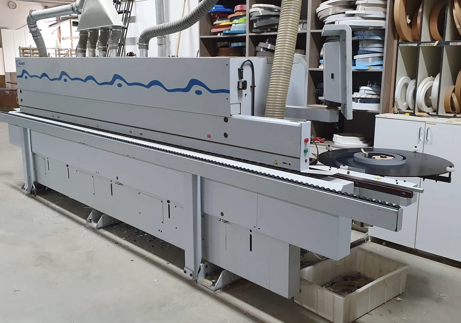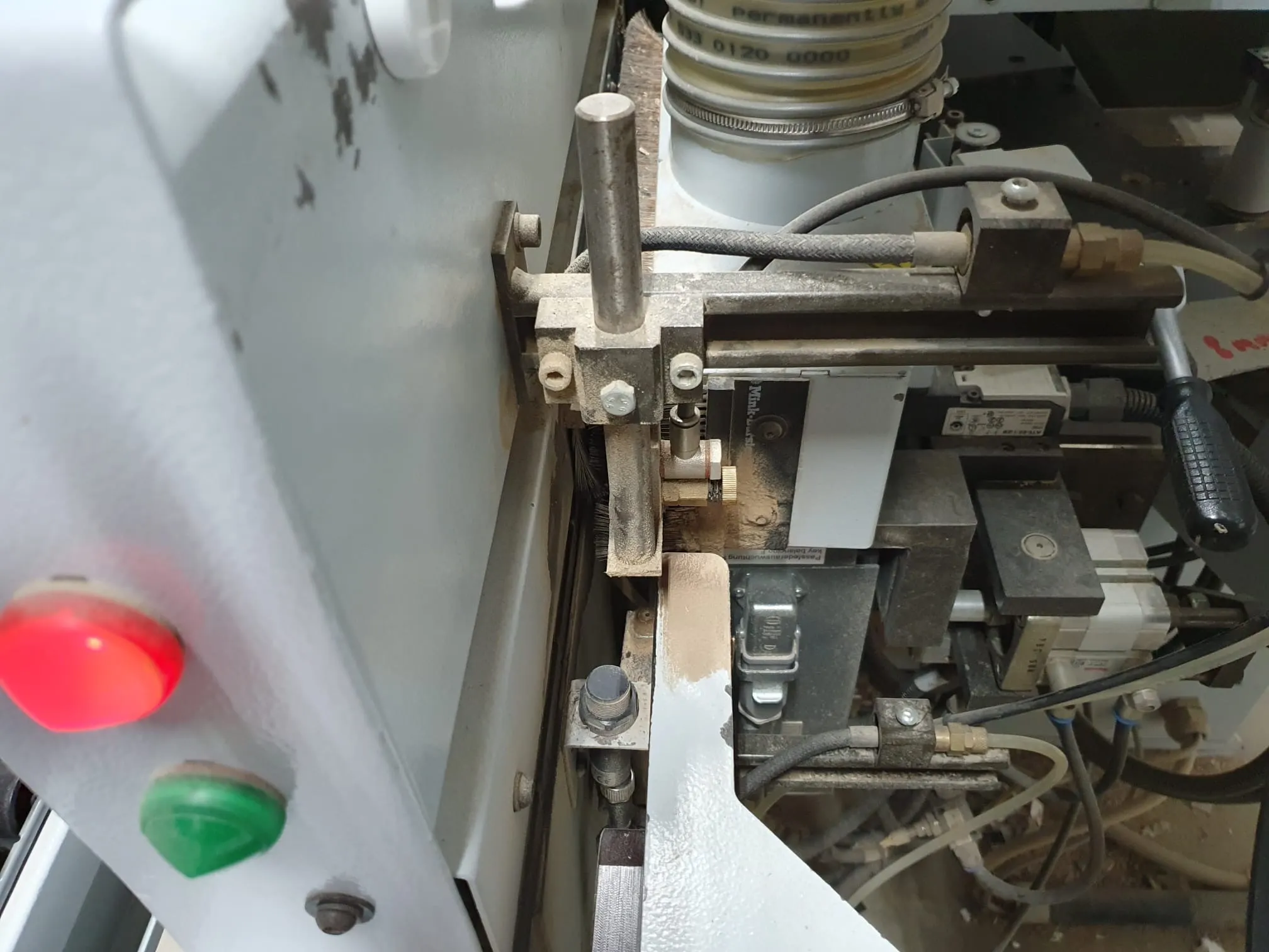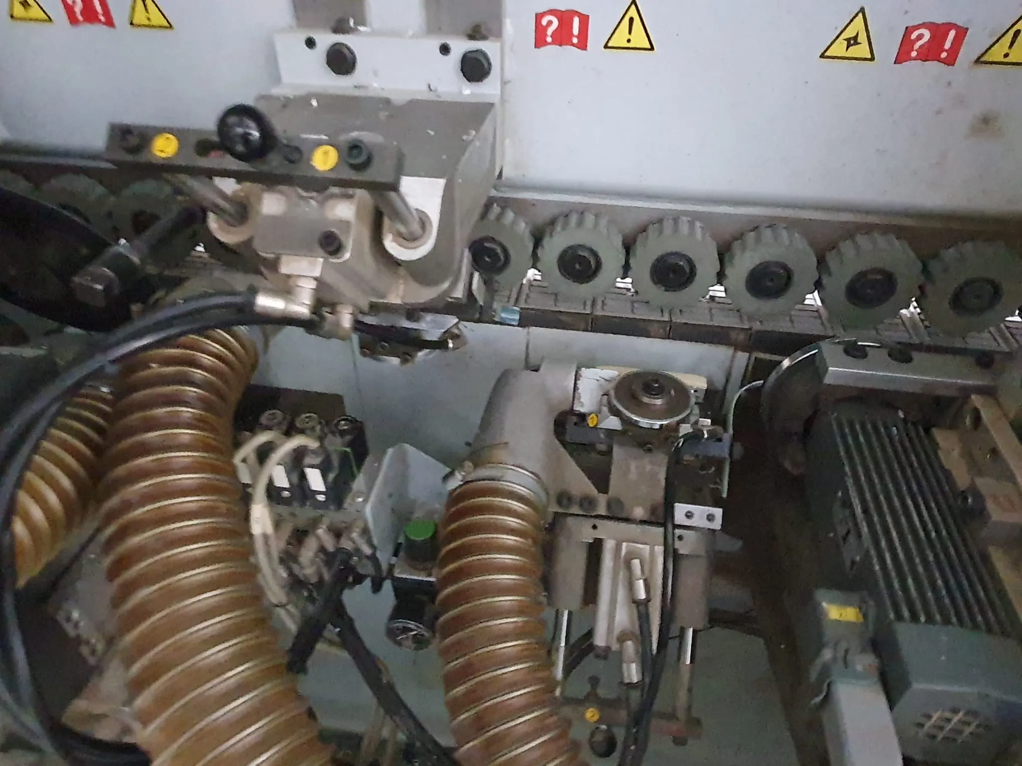 Gebrauchtmaschine, Vorfräsen/Fügen, hat zwei Kantenfräsen R1 und R2 drauf, Eckenkopieren, Wechselköpfe für Ziehklinge, Nesting Tastung oben/ unten.