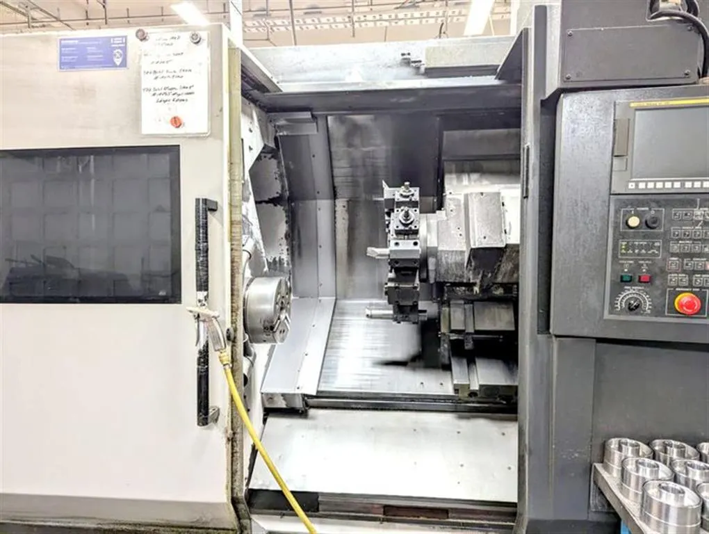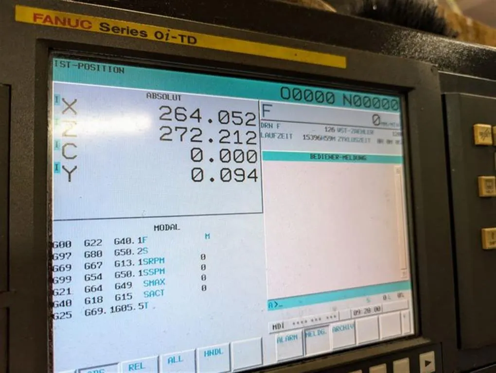 Lager-Nr: 1032-03940 Maschinentyp: CNC Drehmaschine Fabrikat: HWACHEON Typ: HI TECH 450 AL YMC Baujahr: 2012 Steuerungsart: CNC Steuerung: FANUC 0i-TD Lagerort: Karlsbad Ittersbach Halle 1 Ursprungsland: Korea Lieferzeit: sofort Frachtbasis: ab Ausstellungshalle, frei verladen Zusätzliche Informationen: CNC Drehmaschine mit Y-Achse und angetriebenen Werkzeugen, C-Achse, tool eye Hydraulik-Futter D = 250 mm, verstärkte Kühlmittelpumpe 15bar, Spannzylinder mit Spanndruckkompensation, 2-stufiger Spanndruck, Grundplatte für Anbau einer Lünette, progr. Reitstock mit Schleppeinrichtung, angetriebene Werkzeuge 3,7 kW, Drehzahl 3.000 1/min, Späneförderer, 1 angetriebenes Werkzeug ist im Lieferumfang enthalten ca. 15.500 Betriebsstunden Drehdurchmesser: 420 Eilgang X + Z - Achsen: 20 / 24 m/min Umlaufdurchmesser über Schlitten: 550 mm Gesamtantriebsleistung: 50 kVA Revolverkopf (x-fach): 12 Drehzahl: 3500 1/min Hohlspannzylinder mit Stangendurchlaß bi: 76 mm y-Achse: +/- 60 mm Antriebsleistung: 22 / 18,5 kW Umlaufdurchmesser über Bett: 700 mm Raumbedarf ca.: 4,10 x 2,05 x 2,21 m Spitzenweite: 1390 mm Anzahl Revolver: 1 / 12 x BMT Gewicht: 7,8 t Drehlänge: 1230 mm