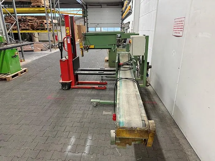 Universell einsetzbare Abstapelung Sicko ASF mit Hochhubwagen zum Einsatz als Mechanisierung hinter Hobelmaschinen oder ähnlichen Bearbeitungsmaschinen.