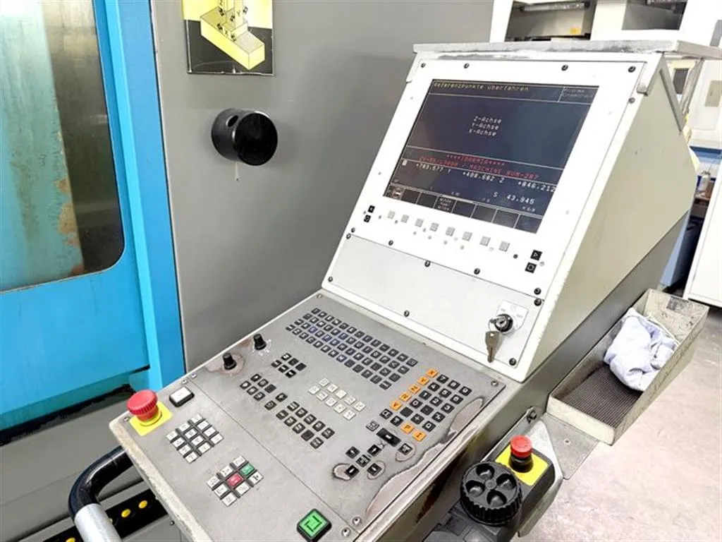 Zusätzliche Informationen: 3-Achs-Vertikalbearbeitungszentrum, 4. Achse vorbereitet (Kabel und Stecker), IKZ 40 bar, Späneförderer, el. Handrad HR 410, Trennwand für Pendelbearbeitung, 3D-Messtaster, direktes Messsystem, Spülpistole, Tischerhöhung 100mm, Bettspülung, Spindel-Ölkühlung, ca. 53.000 Einschaltstunden, ca. 18.500 Programmlauf-Stunden